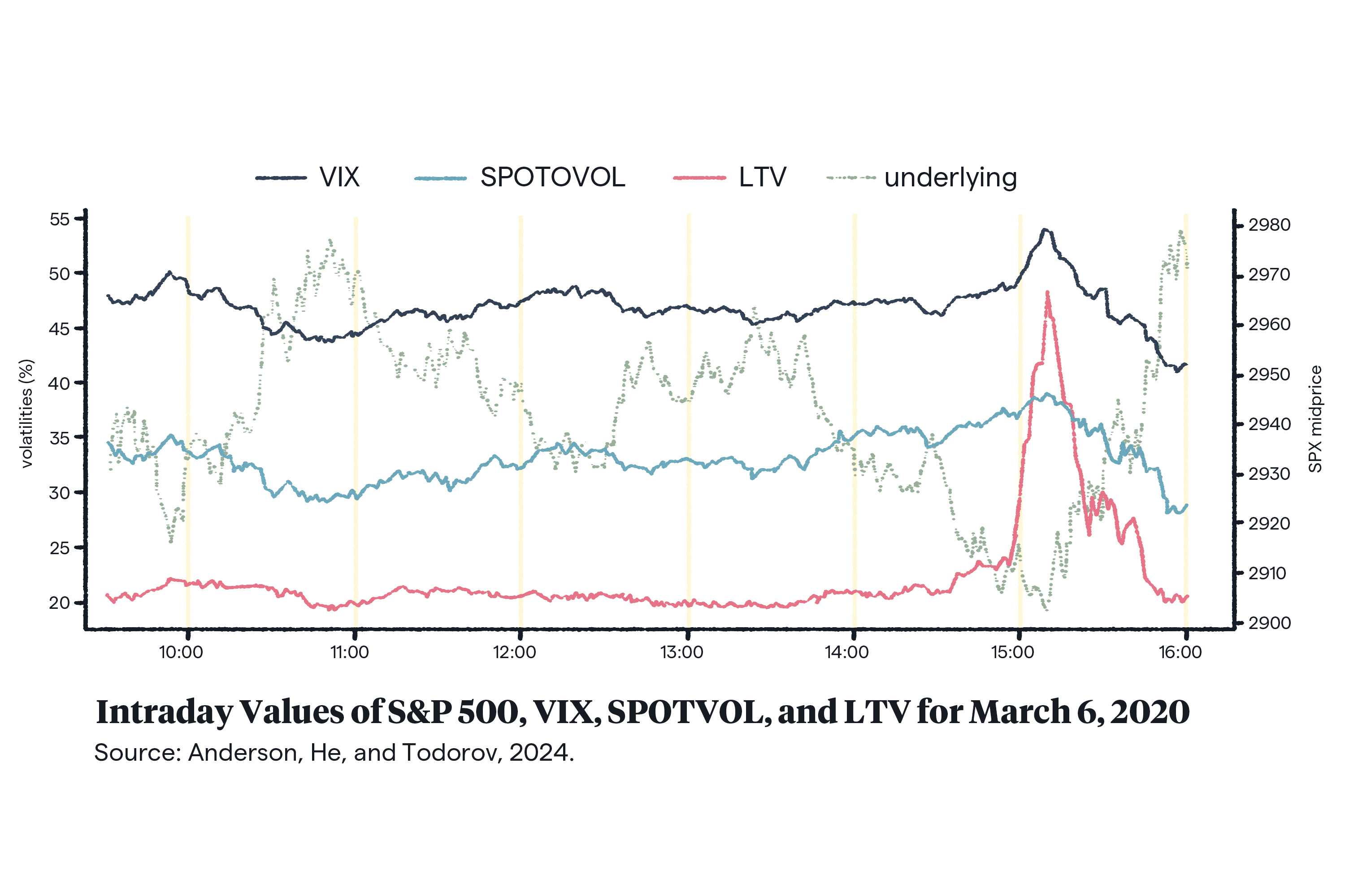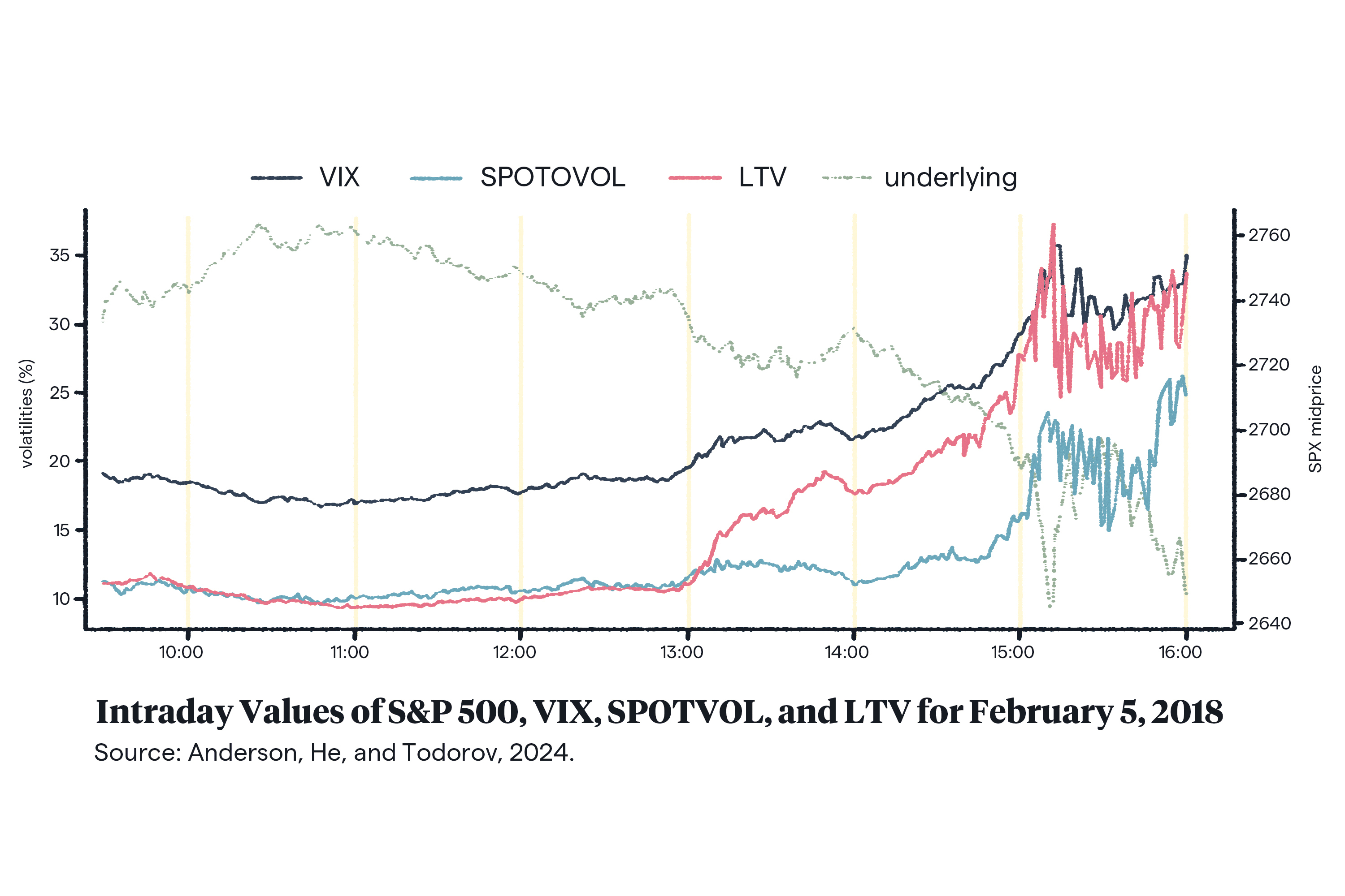 But as the graph below shows, several hours before VIX began its sharpest increase, LTV had already started to diverge from the SPOTVOL. “In this case,” Andersen and Todorov write, “LTV served as an effective early indicator of the turbulent market conditions that followed, sending a much stronger real-time warning signal than either VIX or SPOTVOL.”