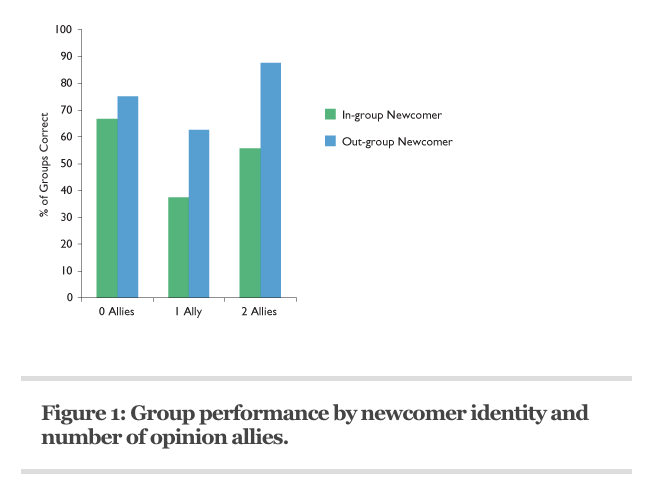 Unsurprisingly, oldtimers felt more comfortable with newcomers who belonged to their sorority or fraternity. But the biggest discovery was the sheer advantage an out-group newcomer gave a group—and this advantage was even more pronounced when the newcomer did not bring in a new idea. Diverse groups with out-group newcomers guessed the correct murder suspect with far greater frequency, while in-group newcomers hindered the groups’ accuracy (Figure 1). And though out-group newcomers increased group accuracy and performance, these groups reported much lower confidence in their decisions.