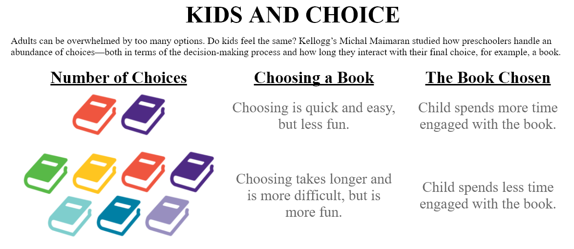 Maimaran, a research associate professor of marketing at the Kellogg School, has been studying decision-making in children for several years. So her ears perked up when the doctor mentioned he had observed parents giving children lots of options about various day-to-day activities: At the park, would she rather play on the slide, or the swings, or kick a ball around, or throw a Frisbee, or climb a tree? At home, which of the dozens of books on her shelves does she want to read?