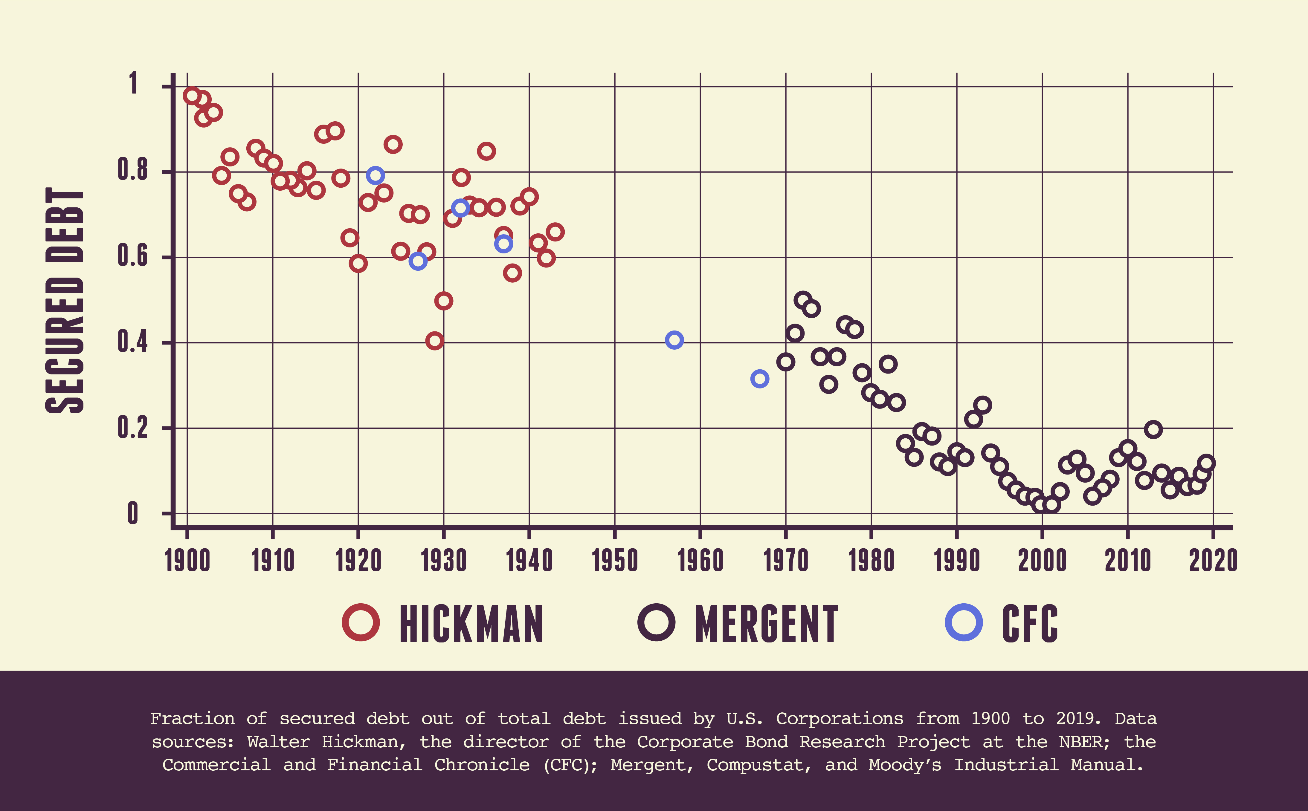 Indeed, the team analyzed the issuance of debt by U.S. corporations since 1900 and found that the percentage of secured debt (out of all debt) fell dramatically, from a peak of 98.5 percent in 1900 to just below 5 percent in the early 2000s.