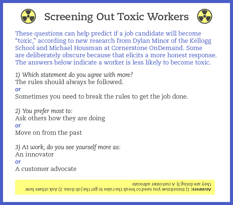 Several questions in the job-screening questionnaire evaluated how “other-regarding” the candidates were, meaning how willing they were to address other people’s concerns. Not surprisingly, the more other-regarding the candidates, the less likely they were to become toxic.