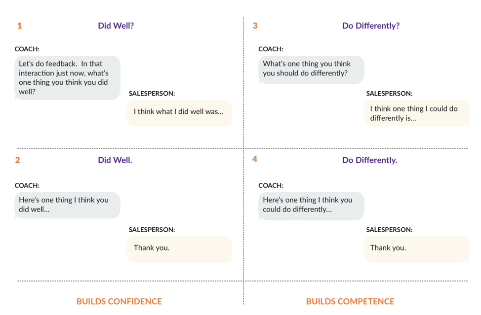When providing feedback about those specific performances, Wortmann encourages sales leaders to use the following simple framework to build salespeople’s confidence and competence.