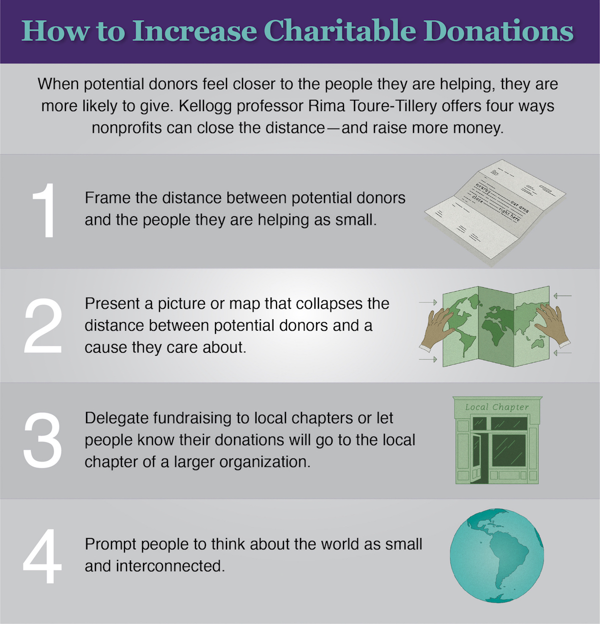 Overall, however, the study suggests that altering perceptions of distance can affect people’s decisions to give—even if the actual proximity has not changed. Organizations might consider crafting their appeals to make recipients seem closer to home. For example, an international charity could designate a local branch as the point of contact for donations. [See inforgraphic above for more ideas.]