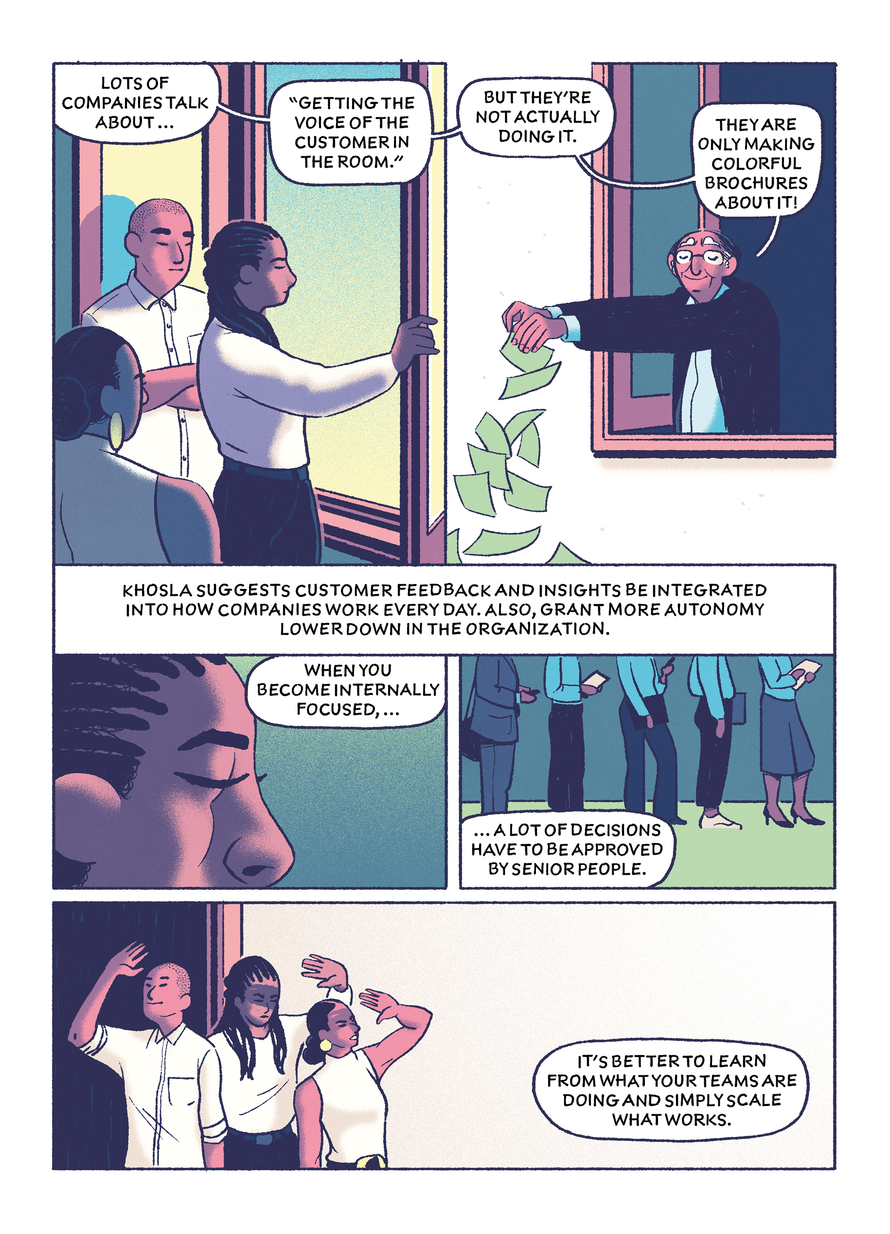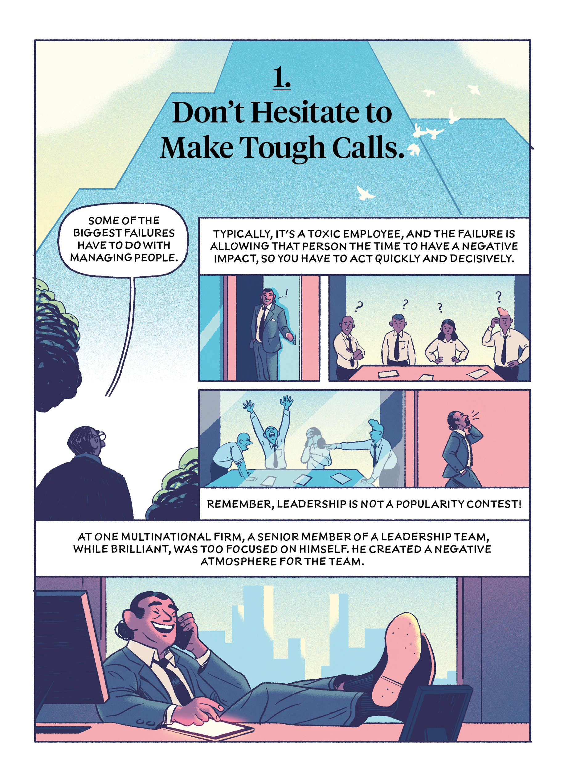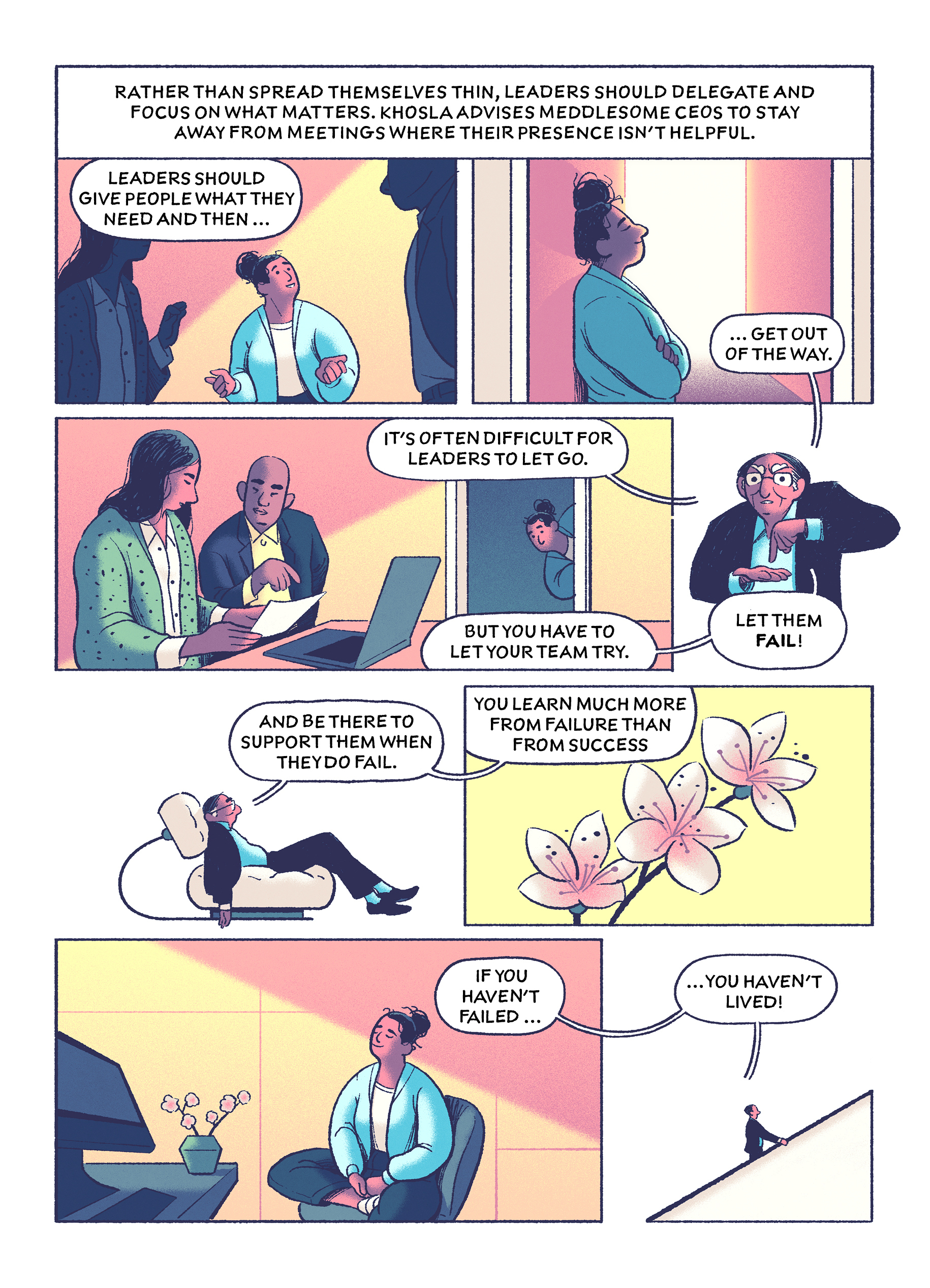 In this comic drawn by Michael Meier, Khosla lays out lessons that you can take away from five common leadership failures.