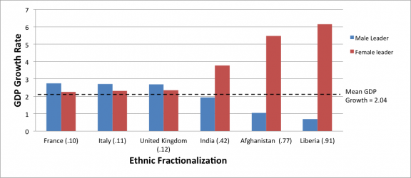 The authors’ analysis reconfirmed the association between highly diverse countries and sluggish economic growth. But when the gender of a national leader was taken into account, the relationship between EF and GDP became dramatically polarized. Their model predicts that in highly diverse countries, having a female leader is associated with a 6% higher GDP growth rate, on average, than having a man at the helm. The more diverse the nation, the more extreme the effect: “In Liberia, one of the most ethnically fractionalized countries we surveyed, the predicted GDP growth was 6.15% under a female leader and 0.69% if the leader was male,” Pearce says.