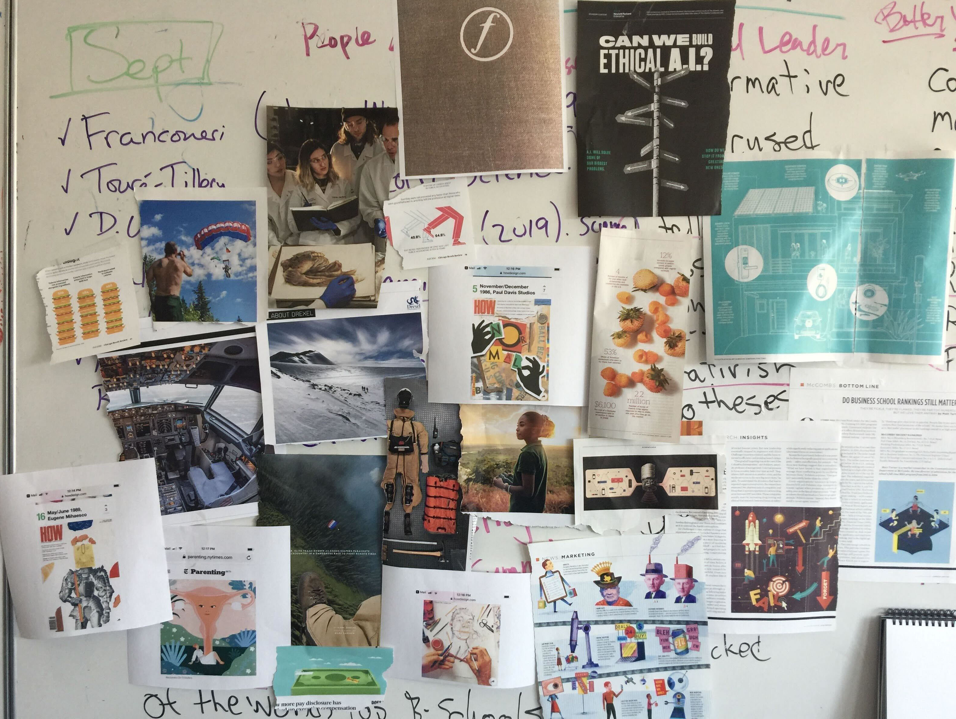 LOVE: As we’ve discussed on previous episodes, around the time we spoke with Calder, our team at Kellogg Insight was in the process of developing a new podcast brand…one for the podcast you’re listening to now... So, once again, we were eager to test out this advice for ourselves. We’d already figured out our brand position, and we were ready to start designing. So we all brought in old magazines, and looked through them for anything we thought matched what our brand was going for. We cut out photos, ads, and infographics, and taped them all up on our office whiteboard. It was a real hodgepodge.