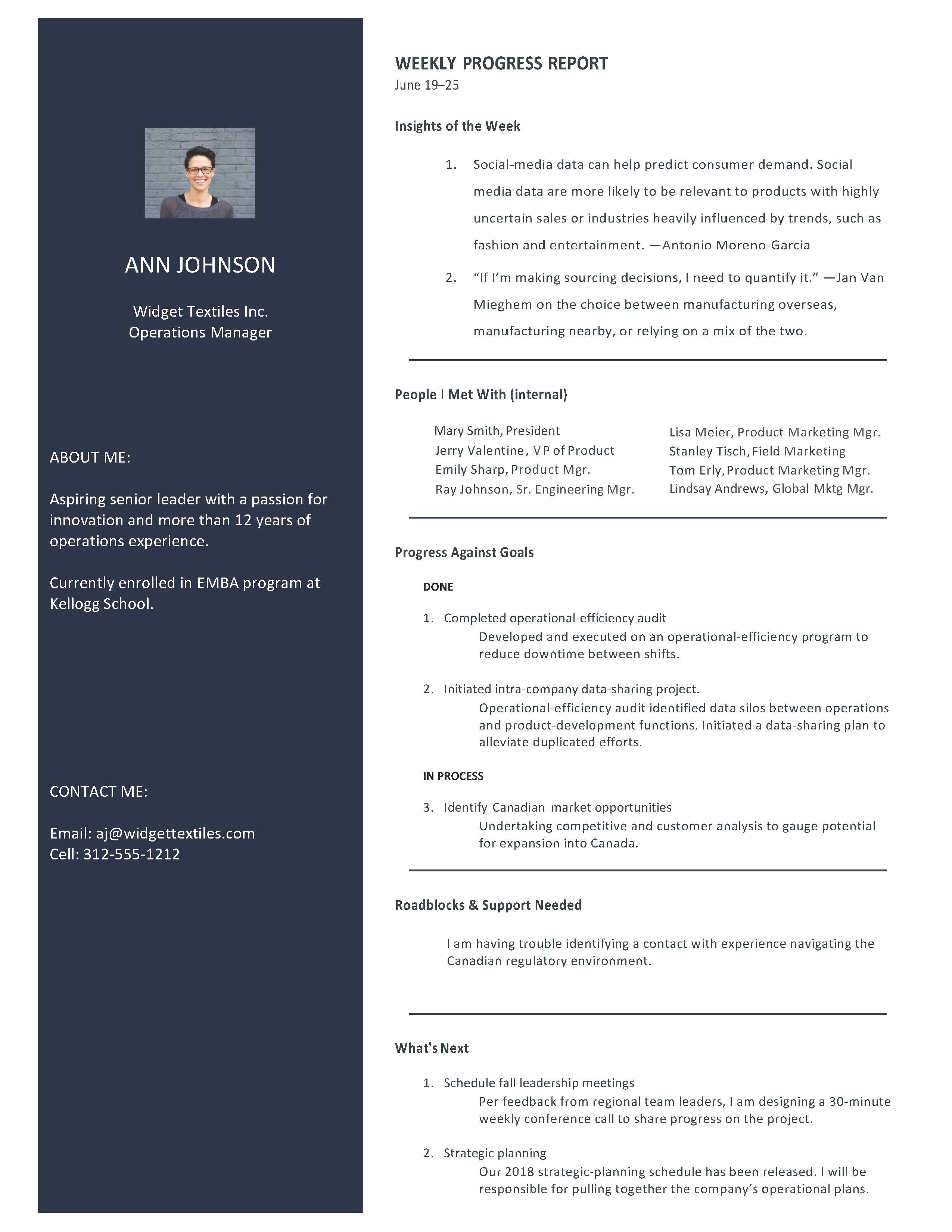 SCHMALZ: Your memo to the boss—well, one that actually goes to your boss—might include a list of steps you’ve taken toward your goals, people you’ve met with, recent insights you’ve had, and upcoming meetings or conferences you’ll be attending.