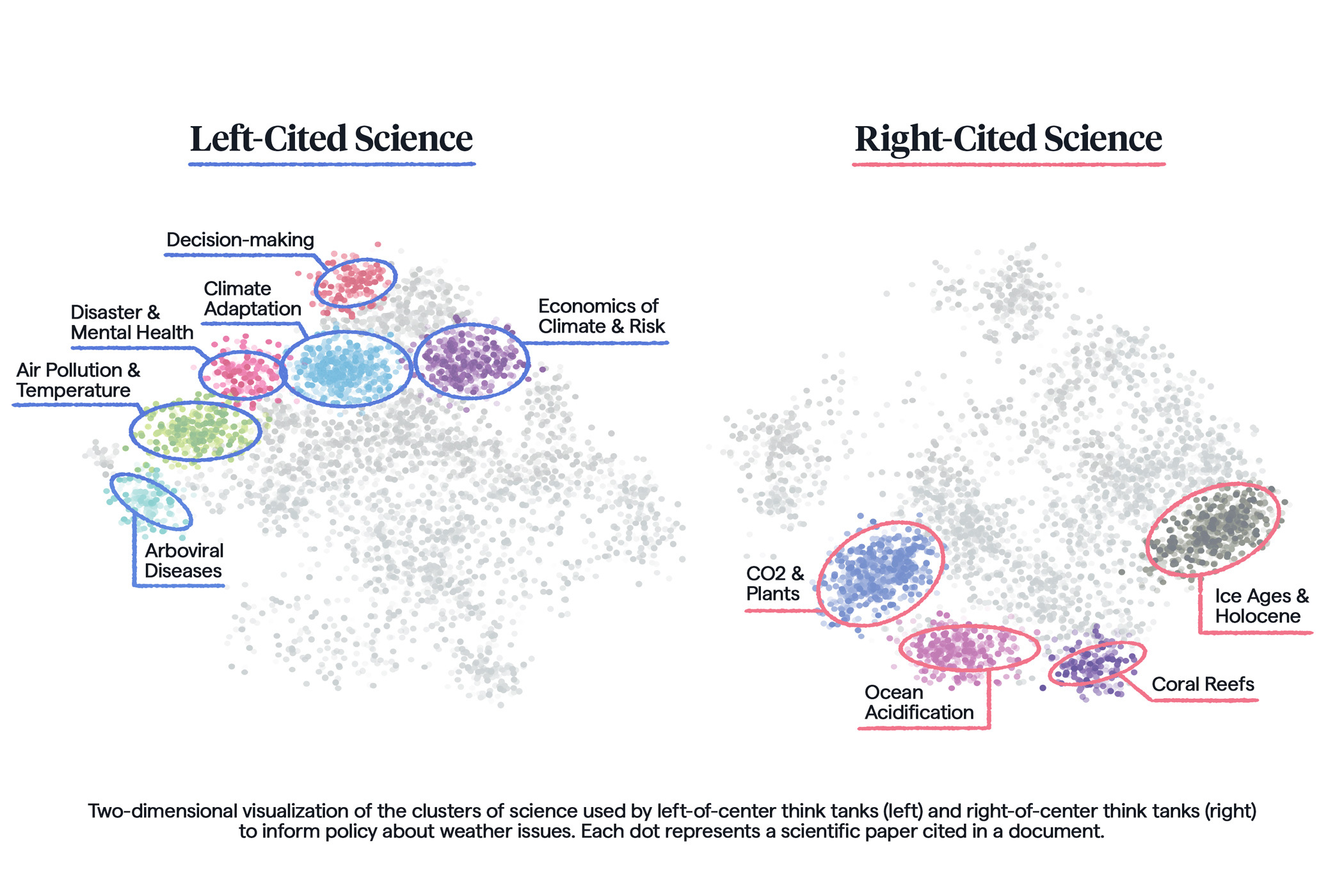 The researchers used a deep-learning algorithm to plot each of the cited scientific papers as a point in space, grouped by topic. This technique allowed them to quantify and visualize the distinct clusters of science that Republican versus Democratic committees and think tanks referenced in their policy documents.