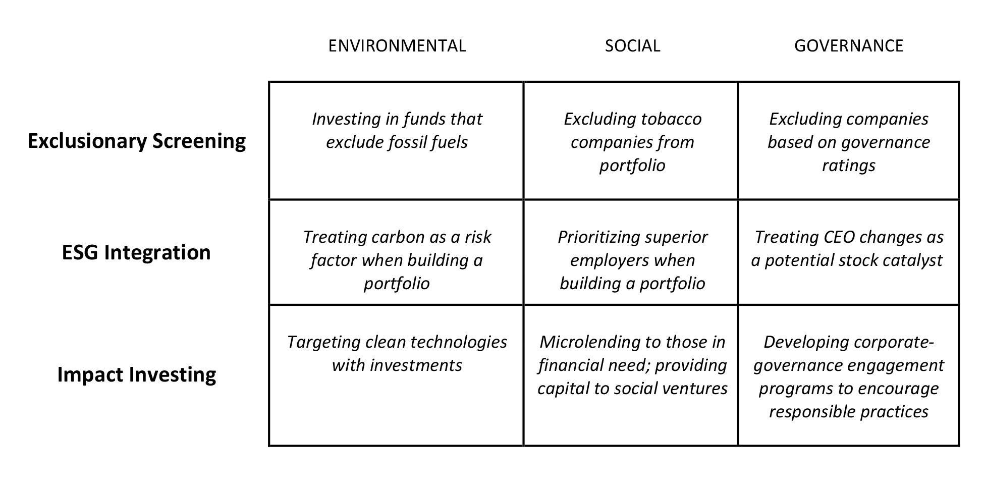In the chart below, Bruce provides examples of how these three different approaches might tackle various environmental, social, or governance goals.