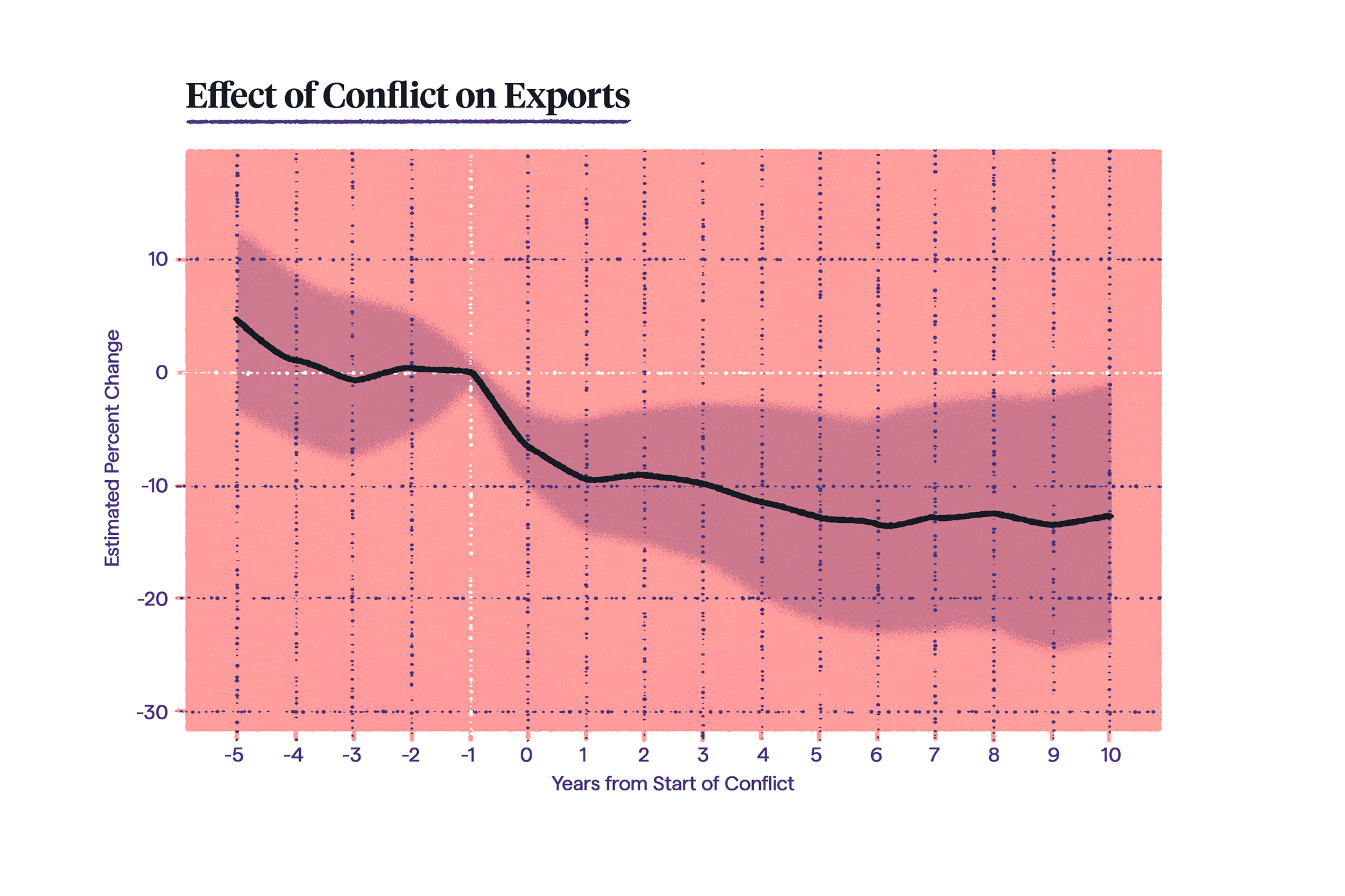 They also matched each of the countries in war to a selection of 221 countries that were similar in terms of GDP, region, debt, and level of democracy but not involved in a war during the same period. By benchmarking the economic performance of warring countries to these control countries, they were able to rule out factors other than war, such as natural disasters or poor governance, that could have otherwise significantly changed a country’s economy.