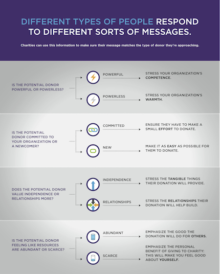 Charities should therefore ask themselves which type of donor they are targeting. If the donor is feeling powerful, then stressing the organization’s ability to meet goals and produce tangible results will likely be more persuasive and elicit more money. If the donor is feeling powerless, then talking about the group’s trustworthiness and ability to make people feel cared for is best.