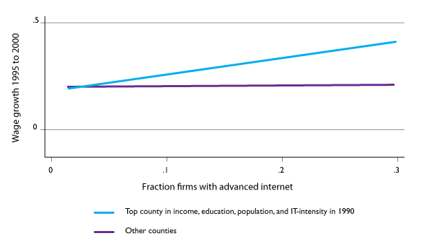 Out of about 3,000 counties in the U.S., in only 163 did business adoption of Internet technologies correlate with wage and employment growth, the study found. All of these counties had populations above 150,000 and were in the top quarter of income and education levels before 1995. Between 1995 and 2000, they showed a 28 percent average increase in wages, compared with a 20 percent increase in other counties (Figure 1).